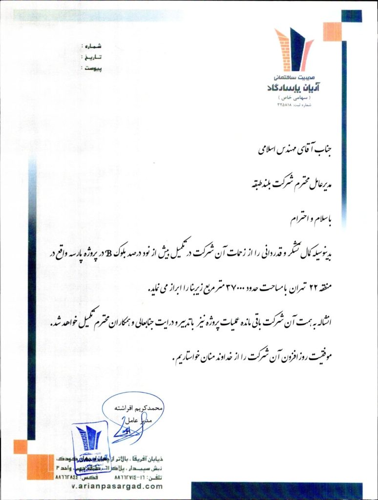 تقدیر نامه و پیام تشکر و قدردانی آقای مهندس افراشته مدیر عامل محترم شرکت ساختمانی آریان پاسارگاد، کارفرمای محترم پروژه برج ۲۴ طبقه پارسه،به جناب آقای مهندس اسلامی مدیرعامل محترم شرکت بلند طبقه بابت قدردانی از زحمات شرکت بلندطبقه در تکمیل بیش از ۹۰ درصد بلوک B پروژه پارسه.