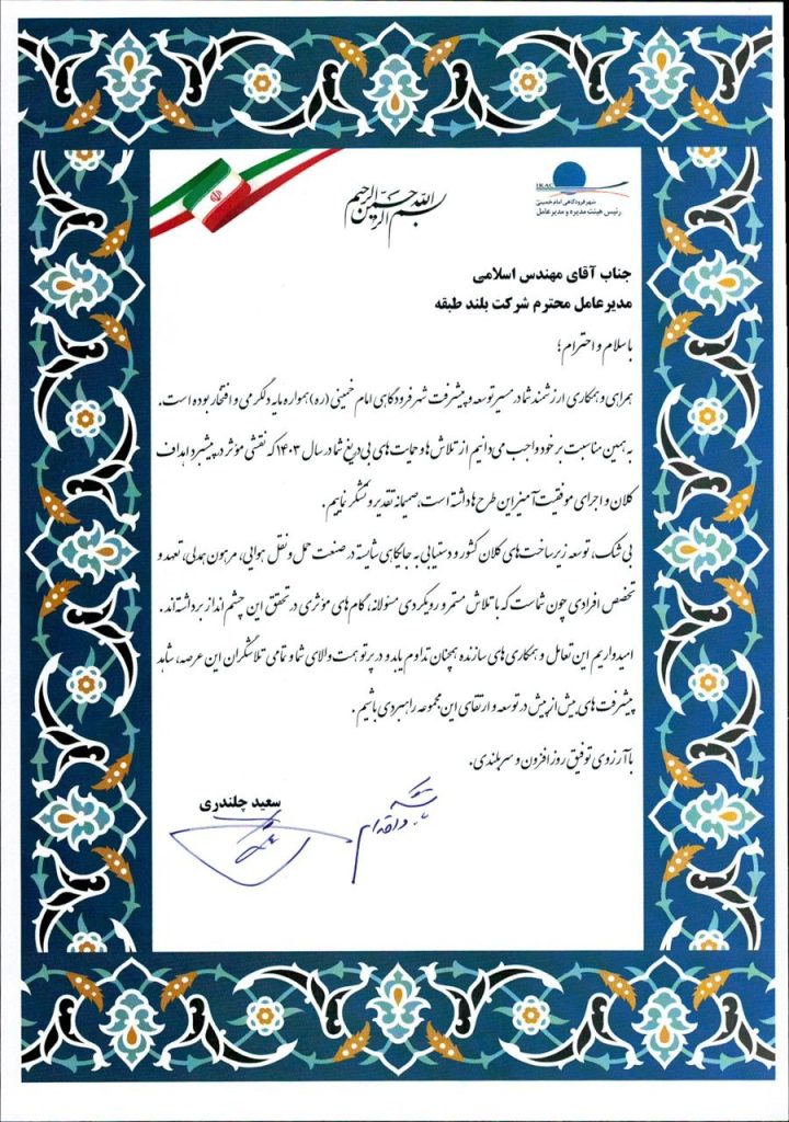 تقدیر و تشکر جناب آقای دکتر چلندری مدیرعامل محترم شهر فرودگاهی امام خمینی (ره)از همراهی و همکاری ارزشمند و تلاش ها و حمایت های بی دریغ شرکت بلند طبقه و مدیر عامل محترم جناب آقای مهندس اسلامی در مسیر توسعه و پیشرفت شهر فرودگاهی امام خمینی (ره)